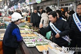 oto방송 김민석 기자 | 박정현 부여군수가 민족 최대 명절인 설을 앞두고 15일 지역 전통시장을 찾아 민생경제 현장을 점검하고 상인들을 격려했다. 박 군수는 중앙시장과 새시장, 부여시장 등 관내 주요 전통시장을 찾아 직접 굿뜨래페이를 사용해 설 장보기를 하며 장바구니 물가와 시장 환경을 꼼꼼히 살폈다. 또한 시장 상인들과의 대화를 통해 현장의 목소리를 청취하고, 전통시장 활성화를 위한 실질적인 지원 방안을 논의했다. 특히 부여군은 2026년 민생경제 회복을 위한 첫 번째 정책으로, 2월 한 달간 굿뜨래페이 설맞이 인센티브를 시행하고 있다. 월 구매 한도를 기존 150만 원에서 200만 원으로 상향하고 인센티브도 기존 10%에서 최대 15%까지 상향했다. 이를 통해 침체된 지역경제에 활력을 불어넣고, 주민과 소상공인 모두에게 실질적인 혜택이 돌아가도록 하고 있다. 박정현 부여군수는 “전통시장은 단순히 물건을 사고파는 공간을 넘어 우리 지역 주민들의 삶과 정이 오가는 공동체의 중심”이라며, “이번 설 명절을 맞아 많은 군민께서 전통시장을 찾아주셔서 어려운 시기를 보내고 있는 상인들에게 따뜻한 힘이 되어주시길 바란
