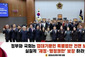 oto방송 김민석 기자 | 충남도의회가 현재 추진 중인 충남·대전 행정통합과 관련해, 통합특별시의 자립적 성장을 위한 재정권과 자치권이 결여된 특별법안을 강하게 비판하며 실질적인 권한 강화를 촉구하고 나섰다. 도의회는 19일 긴급 소집된 제364회 임시회에서 김옥수 의원(서산1·국민의힘)이 대표 발의한 ‘충남대전통합특별시 설치를 위한 특별법안(대안)의 지방재정권 등 통합특별시 권한 강화 촉구 결의안’을 채택했다. 이번 결의안은 현재 국회에서 심사 중인 특별법안이 선언적 지원 규정 중심으로 구성돼 통합특별시의 실질적 권한이 충분히 반영되지 못하고 있다는 문제의식에서 마련됐다. 결의안을 대표 발의한 김옥수 의원은 “행정통합은 단순한 구역 확대를 넘어 지역 스스로 미래를 설계하는 ‘자기결정권’을 갖춘 강력한 지방정부를 구축하는 과정이어야 한다”며 “중앙정부의 일시적인 지원에 의존하는 방식으로는 장기적인 자립과 성장을 기대할 수 없다”고 강조했다. 특히 현재의 통합 논의가 작년 7월 충남도의회와 대전시의회가 실질적 자치권 보장을 전제로 합의했던 취지를 정면으로 위배하고 있다고 지적하며, “이대로라면 통합