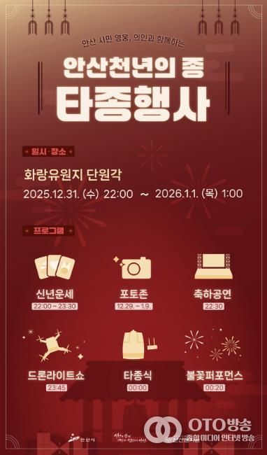 oto방송 김민석 기자 | 안산시는 오는 31일 오후 10시부터 화랑유원지 단원각에서 ‘2026 안산 천년의 종 타종 행사’를 개최한다고 30일 밝혔다.