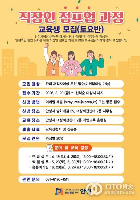 oto방송 김민석 기자 | 안성시에서 운영 중인 안성시여성비전센터에서는 토요반으로 직장인들의 직무능력 향상 교육을 위한 점프업 과정을 진행한다고 밝혔다. 교육과정은 재직자들이 가장 많이 사용하는 정보화 프로그램 3개 과정으로 한글(HWP), 엑셀(XLSX), 캡컷(CAPCUT)을 활용하여 실무교육을 진행한다.