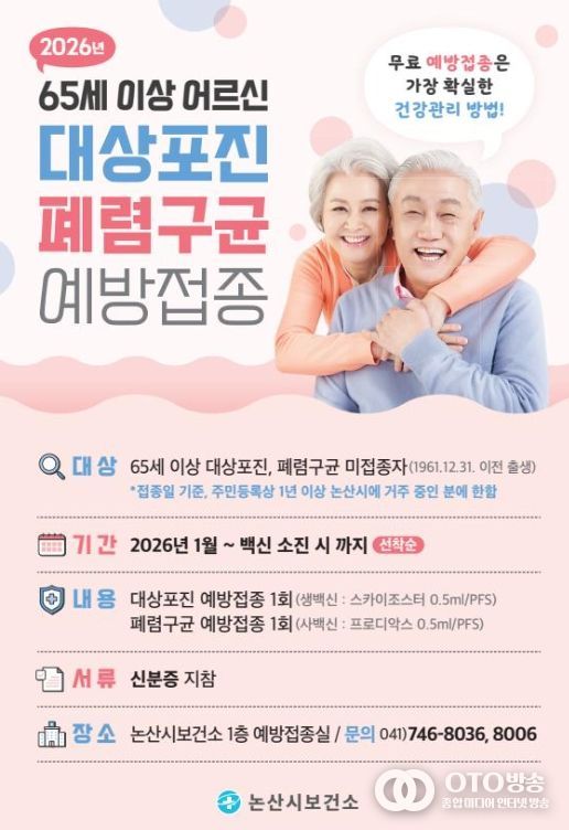 접종 대상은 접종일 기준 논산시에 1년 이상 주민등록을 둔 만 65세 이상(1961년 이전 출생자) 시민으로, 기존 접종 이력이 있거나 백신 금기자는 제외된다.