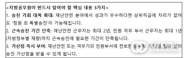 근속 승진 기회도 단축된다. 특히 재난안전 분야에서 2년 이상 근무한 공무원의 경우, 현재 1년까지 단축 가능한 근속승진 기간을 최대 2년까지 단축할 수 있도록 의무화했다.