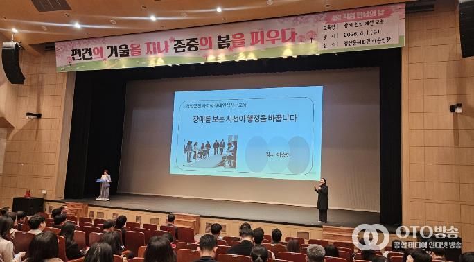 군은 지난 1일 청양군 문예회관 대공연장에서 소속 직원 300여 명이 참석한 가운데 ‘2026년 사회적 장애인식개선 교육’을 실시했다고 밝혔다.