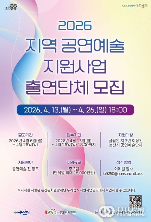 oto방송 김민석 기자 | (재)논산문화관광재단은 오는 4월 13일부터 4월 26일까지 ‘지역 공연예술 지원사업’ 출연단체 모집 공모를 진행한다.