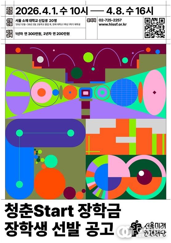 oto방송 김민석 기자 | 서울미래인재재단이 ㈜두산 임직원 기부금으로 14년째 운영 중인 '청춘Start장학금' 14기 장학생 20명을 모집한다. 서울 소재 대학에 올해 입학한 저소득 신입생을 대상으로 2년간 총 500만 원의 학업장려금을 지급하며, 신청은 4월 8일 16시까지 재단 누리집에서 받는다.