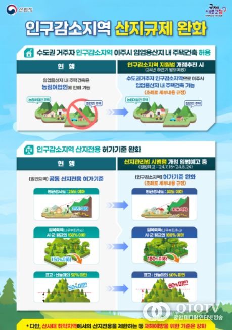 oto방송 김민석 기자 | 산림청은 수도권 거주자의 인구감소지역 이주 시 산지규제를 완화해 임업용 산지 내 주택건축을 허용한다고 18일 밝혔다.