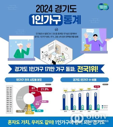 oto방송 김민석 기자 | 경기도 1인가구는 171만 가구이며, 도 전체 가구 가운데 31.2%를 차지하고 있는 것으로 나타났다. 경기도의 1인가구 수는 2020년부터 매년 전국 최고치를 경신하고 있다.