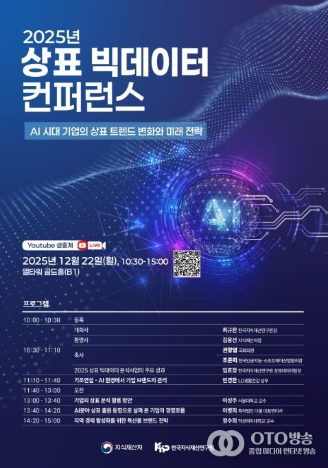 oto방송 김민석 기자 | 지식재산처가 주최하고 한국지식재산연구원이 주관하는 ‘2025년 상표 빅데이터 학술회의’가 12월 22일 10시 30분 엘타워 골드홀(서울 서초구)에서 개최된다.