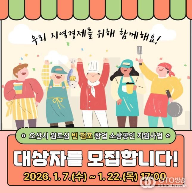 oto방송 김민석 기자 | 오산시는 오산역 앞 아름다로(구 문화의 거리) 일대 원도심 빈 점포를 활용한 창업 소상공인을 대상으로 임차료를 지원하는 ‘원도심 빈 점포 창업 지원’ 사업의 대상자를 이달 22일까지 모집한다고 밝혔다.