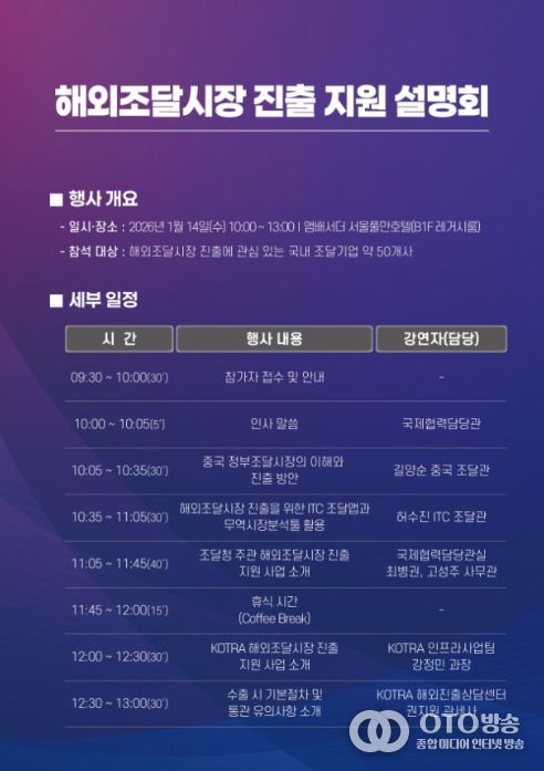 oto방송 김민석 기자 | 조달청은 14일 앰배서더 서울 풀만호텔에서 조달기업 60여 개사를 대상으로 해외조달관 초청 ‘해외조달시장 진출 지원사업 설명회’를 개최했다.