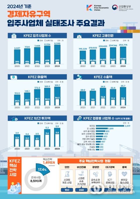 이번 조사 결과, 경제자유구역 내 외국인투자기업 수는 전년 대비 8.2% 증가했으며, 고용은 8.8%, 투자액은 14.4% 증가하는 등 주요 지표 전반에서 긍정적인 흐름이 확인됐다.
