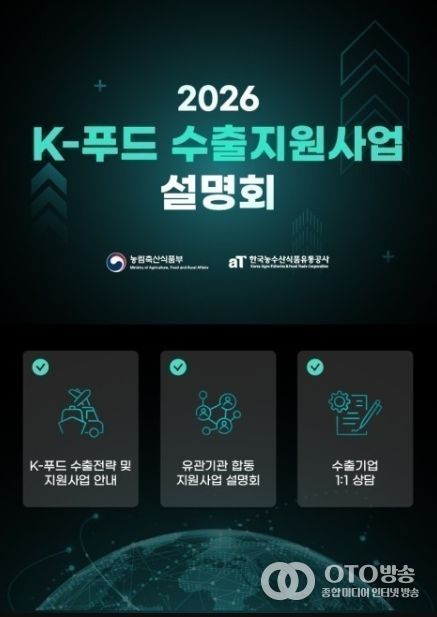 oto방송 김민석 기자 | 농림축산식품부는 K-푸드의 글로벌 진출 확대를 위해 전년보다 900억원 증가한 7,070억원 규모의 2026년 K-푸드 수출지원사업 설명회를 1월 23일 서울 과학기술컨벤션센터에서 개최한다고 밝혔다.