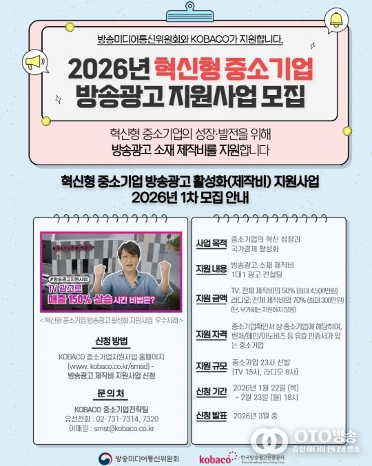 방송미디어통신위원회와 한국방송광고진흥공사는 22일 ‘2026년 중소기업‧소상공인 방송광고 제작지원사업’ 공개모집을 22일부터 한 달여간 진행한다고 밝혔다.