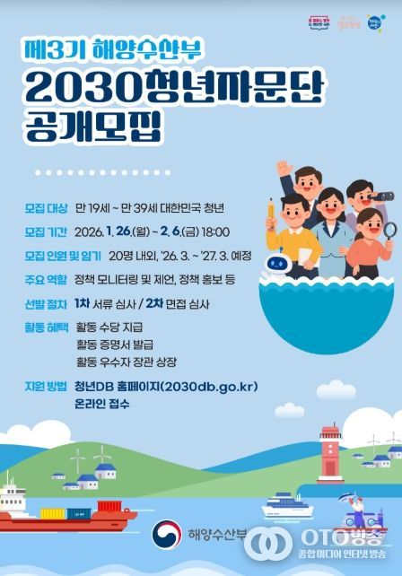 oto방송 김민석 기자 | 해양수산부는 해양수산 정책 전반에 대한 청년세대의 다양한 의견을 수렴하고 청년들의 정책 참여 기회를 확대하기 위해 1월 26일부터 2월 6일까지 ‘제3기 해양수산부 2030청년자문단’을 공개 모집한다고 밝혔다.
