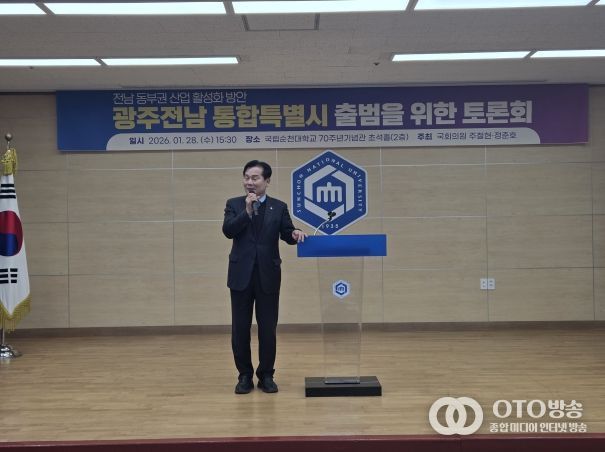 oto방송 김민석 기자 | 더불어민주당 주철현 국회의원(전남 여수시갑)은 28일, 국립순천대학교에서 ‘전남광주특별시’ 출범 과정에서 전남 동부권 산업의 역할과 경쟁력 강화를 논의하기 위한 '광주전남 통합특별시 출범 토론회'를 개최했다.