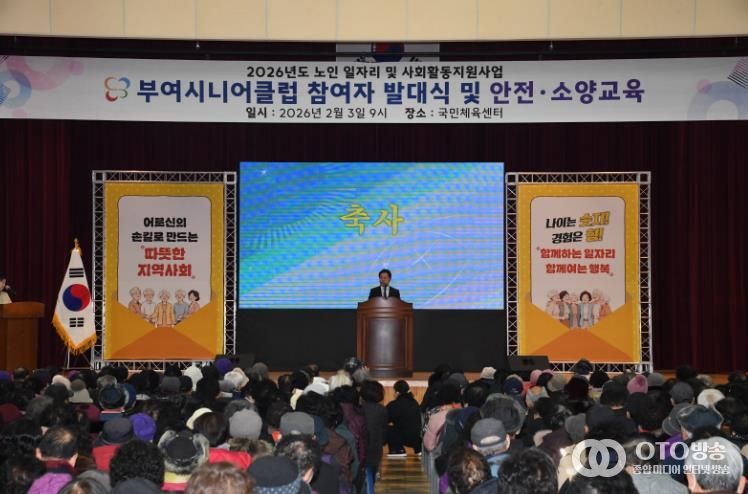 oto방송 김민석 기자 | 부여시니어클럽은 지난 3일 부여국민체육센터에서 노인일자리 및 사회활동 지원사업 참여 어르신 약 2,040명을 모시고, 2026년 노인일자리 발대식 및 안전교육을 실시했다.