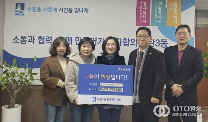 oto방송 김민석 기자 | 수원시 영통구 매탄3동은 지난 3일 매탄3동 단체장협의회가 다가오는 설 명절을 맞아 관내 어려운 이웃들을 위해 누리상품권 300장(총 300만원 상당)을 기부했다고 밝혔다.
