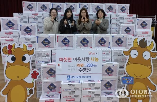 oto방송 김민석 기자 | 수병원은 지난 4일, 설 명절을 맞아 어려운 이웃들을 위해 라면 200박스를 우만1동 행정복지센터에 기부하며 이웃사랑을 실천했다.