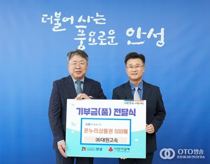 oto방송 김민석 기자 | 안성시는 2월 3일 대원고속으로부터 지역의 어려운 이웃을 돕기 위한 온누리상품권 500매(500만 원 상당)를 전달받았다고 밝혔다.