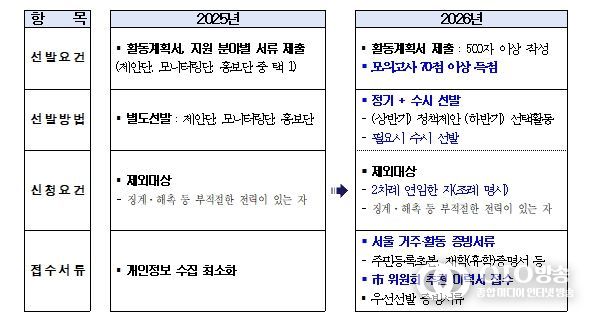 활동 방식도 청년들의 의사에 따른 자율적 참여를 기반으로 재설계했다. 기존에는 정책제안단, 모니터링단, 홍보단 등 역할별로 구분해 선발했으나, 올해부터는 역할 구분 없이 선발한다. 상반기에는 모든 참여자가 정책 제안 활동에 공통으로 참여하고, 하반기에 참여자가 희망하는 활동을 선택하도록 참여 방식을 개편했다.