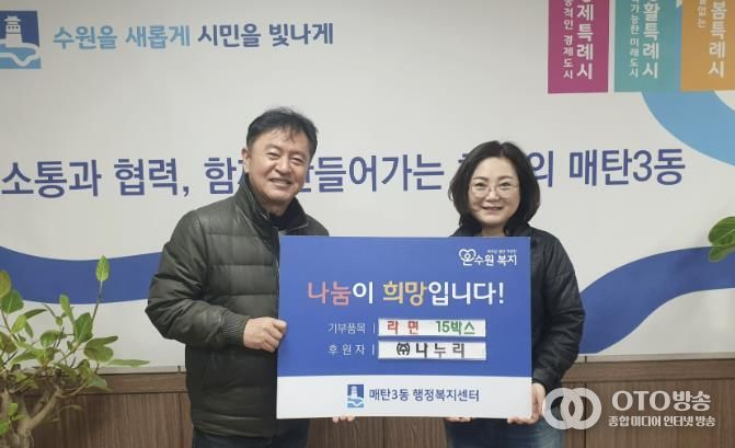 oto방송 김민석 기자 | 수원시 영통구 매탄3동 행정복지센터는 지난 6일, 관내 폐기물 수거업체인 ㈜나누리로부터 설 명절을 맞아 어려운 이웃을 위한 라면 15박스를 기탁받았다고 밝혔다.