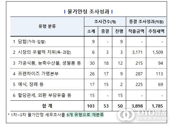 이에 국세청은 ’25.9월부터 ’26.1월까지 3차에 걸쳐, 과도한 가격 인상으로 폭리를 취하며 탈세를 일삼은 담합, 독・과점, 가공식품・생필품 제조, 농축수산물 유통 등 103개 업체에 대해 조사를 실시했으며, ’25.9.25. 착수한 1차 세무조사 결과, 53개를 종결하여 3,898억 원을 적출하고, 1,785억 원을 추징했다.
