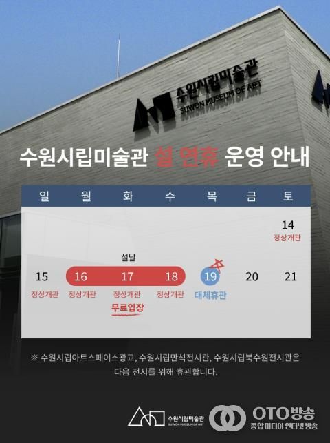 수원시립미술관 행궁 본관 외 수원시립아트스페이스광교, 수원시립만석전시관, 수원시립북수원전시관은 설 연휴 기간 휴관한다.