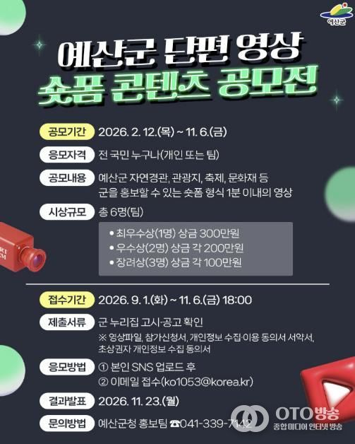 oto방송 김민석 기자 | 예산군은 지역의 숨은 매력을 담은 단편 영상(숏폼) 콘텐츠 발굴을 위해 ‘예산군 숏폼 콘텐츠 공모전’을 개최한다고 12일 밝혔다.