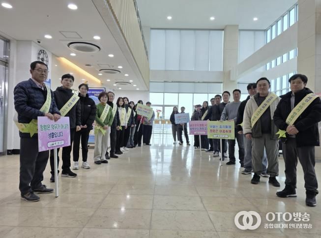 oto방송 김민석 기자 | 예산군 공공시설사업소는 청렴한 공직문화 조성과 청렴의식 확산을 위해 지난 11일 1100년기념관 1층에서 전 직원이 참여한 가운데 청렴 캠페인을 실시했다.