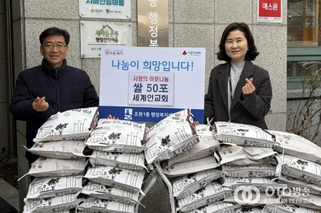 oto방송 김민석 기자 | 수원시 장안구 조원1동에 위치한 대한예수교장로회 세계인교회에서 지난 11일, 설 명절을 맞이하여 조원1동 행정복지센터에 백미10kg 50포를 전달했다.