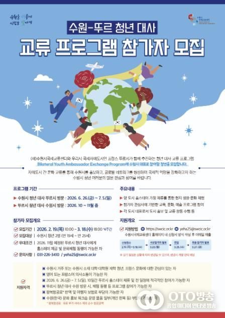 oto방송 김민석 기자 | 수원시국제교류센터는 수원시의 국제자매도시인 프랑스 뚜르시와 추진하는 ‘2026 수원-뚜르 청년 대사 교류 프로그램’에 참여할 수원시 청년 2명을 3월 18일까지 모집한다.