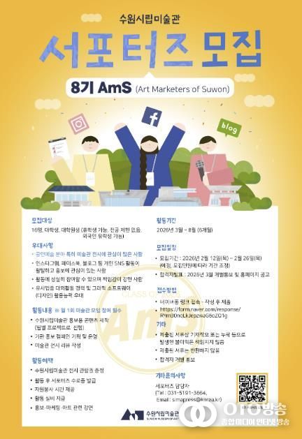 oto방송 김민석 기자 | 수원시립미술관은 미술관의 전시를 체험하고 마케팅 활동을 진행할 제8기 서포터즈 AmS(Art Marketers of Suwon)를 2월 26일까지 모집한다.