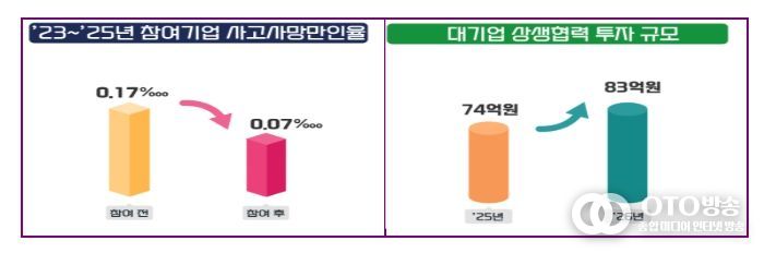 oto방송 김민석 기자 | 고용노동부와 한국산업안전보건공단(이사장 김현중)은 2월 25일 14시 피스앤파크 컨벤션에서 「2026년 대·중소기업 안전보건 상생협력 우수기업 시상 및 협약식」을 개최했다. 협약식에는 SK하이닉스㈜, 두산에너빌리티㈜, 삼성전자㈜ 등 대기업 52곳과 유한티유㈜, ㈜다원앤컴퍼니 등 중소기업 52곳 그리고 한국경영자총협회(회장 손경식)가 참석했다.