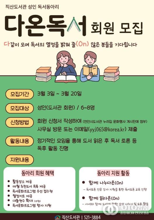 oto방송 김민석 기자 | 천안시 직산도서관은 내달 3~ 20일 성인 독서동아리 ‘다온독서’ 참여자를 모집한다고 26일 밝혔다.