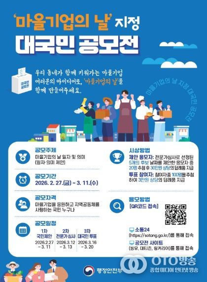 oto방송 김민석 기자 | 행정안전부는 ‘마을기업’에 대한 국민의 이해를 높이고 마을기업 활동을 활성화하기 위해 법정기념일인 ‘마을기업의 날’의 날짜와 의미를 국민이 직접 정하는 대국민 공모를 진행한다고 밝혔다.
