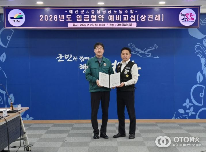 oto방송 김민석 기자 | 예산군은 지난 26일 군청 대회의실에서 충남공공노동조합과 ‘2026년 임금협상을 위한 예비교섭’을 개최하고 본격적인 노사 협상에 돌입했다고 밝혔다.