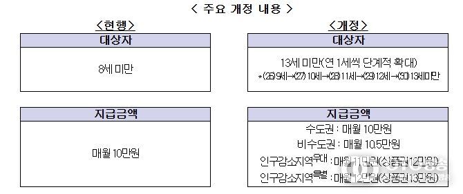 아동수당의 지급 대상을 8세 미만 아동에서 13세 미만 아동까지, 매년 1세씩 단계적으로 확대한다. 단계적 연령 상향에 따라 매년 지급 중단이 반복될 우려가 있는 2017년생 아동은 13세 전까지 끊김 없이 수당을 지급받을 수 있도록 특례도 마련됐다.