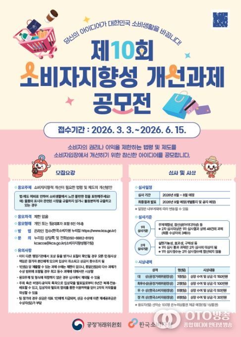 oto방송 김민석 기자 | 공정거래위원회와 한국소비자원은 소비자로부터 다양한 의견과 아이디어를 듣고 이를 법·제도 개선에 반영하고자 '제10회 대국민 소비자지향성 개선과제 공모전'을 개최한다.