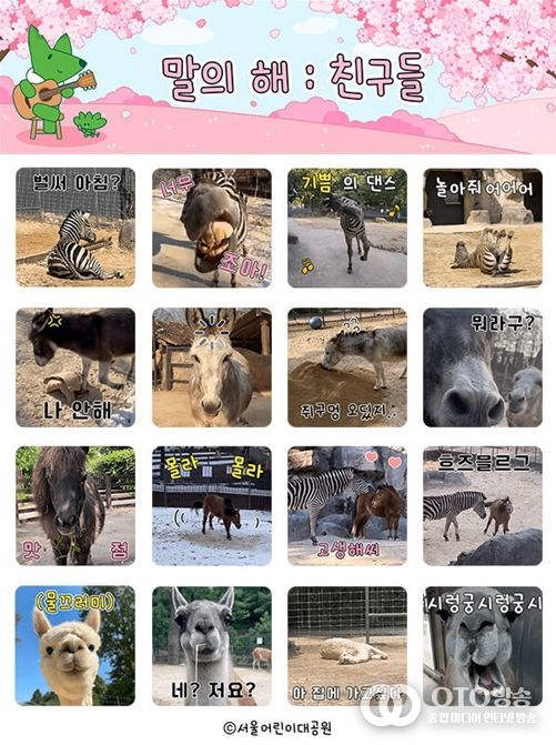 oto방송 김민석 기자 | 서울시설공단은 광진구 능동 서울어린이 대공원에서 ‘말의 해’를 맞아 제작한 ‘말과 친구들’ 카카오톡 이모티콘을 무료 배포하고, 도심 속 농부 체험을 할 수 있는 ‘어린이 텃밭’ 참여 가족을 모집한다고 6일 밝혔다.