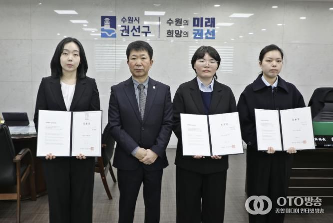 oto방송 김민석 기자 | 수원시 권선구는 지난 5일, 권선구청 2층 집무실에서 신규 공직자 3명이 참석한 가운데 임용장 수여식을 개최했다.