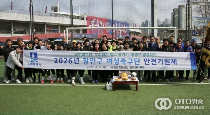 oto방송 김민석 기자 | 수원시 장안구 여성축구단은 지난 5일, 수원종합운동장 인조잔디구장에서 선수단과 관계자 등 30여 명이 참석한 가운데 2026년 안전기원제를 진행했다.