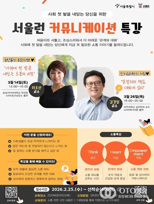 oto방송 김민석 기자 | 서울시가 새로운 환경에 첫발을 내딛는 대학생과 사회 초년생들이 사회 적응 과정에서 겪는 소통의 어려움을 완화하고, 건강한 커뮤니케이션 역량을 높이기 위해 소통 전문가 이호선·김경일 교수와 함께 ‘서울런 커뮤니케이션 특강’을 개최한다.