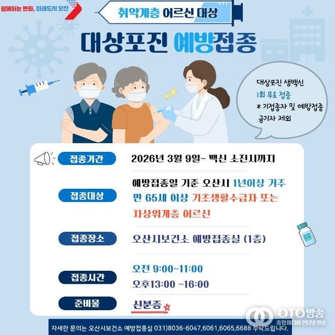 oto방송 김민석 기자 | 오산시보건소는 오는 3월 9일부터 백신 소진 시까지 관내 65세 이상 취약계층 어르신을 대상으로 대상포진 무료 예방접종을 시행한다고 밝혔다.