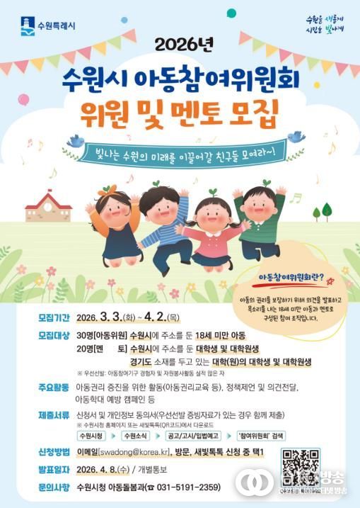 oto방송 김민석 기자 | 수원특례시는 ‘2026년 아동참여위원회’에서 활동할 아동 위원과 대학(원)생 멘토를 모집한다.