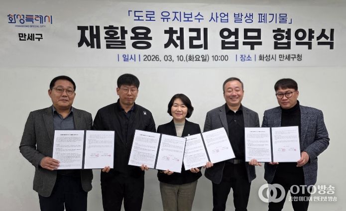 oto방송 김민석 기자 | 화성특례시 만세구가 도로 유지보수 과정에서 발생하는 폐기물을 효율적으로 처리하고 자원 재활용을 확대하기 위해 관내 아스콘 생산 업체와 ‘폐아스콘 재활용 처리 협약’을 체결했다.