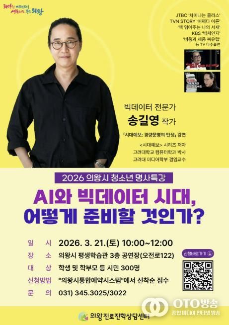 oto방송 김민석 기자 | 의왕시 진로진학상담센터가 3월 21일 오전 10시, 의왕시 평생학습관(오전로 122)에서 청소년과 시민을 대상으로 '2026 상반기 청소년 명사특강'을 개최한다.