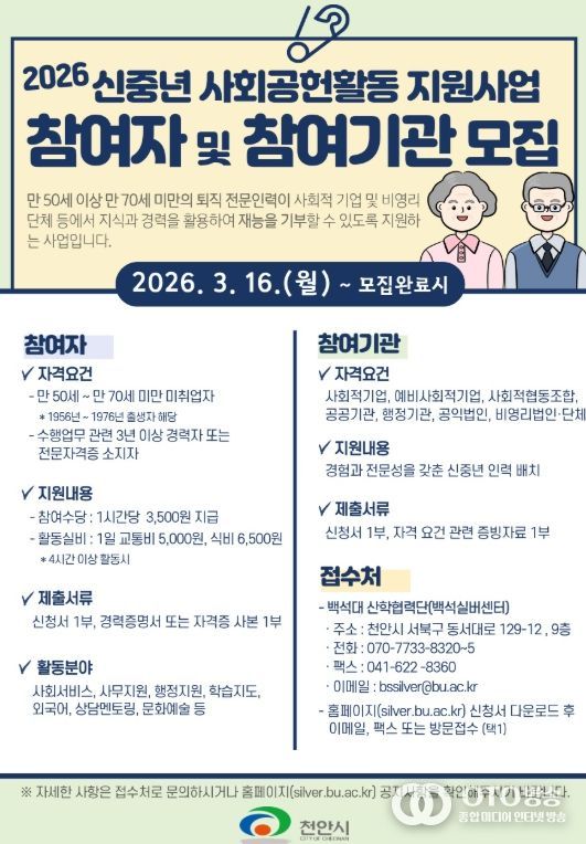 참여기관은 천안시 소재의 비영리법인·단체, 사회적기업, 예비사회적기업, 사회적협동조합 등이다. 선정된 기관은 별도의 인건비 부담 없이 신중년의 전문 역량을 공익사업에 활용할 수 있다.