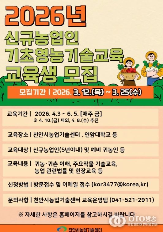 oto방송 김민석 기자 | 천안시농업기술센터는 오는 25일까지 ‘상반기 신규농업인 기초영농기술교육’ 참여자를 모집한다고 13일 밝혔다.