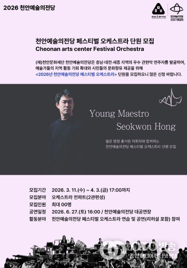 oto방송 김민석 기자 | 천안문화재단은 내달 3일까지 천안예술의전당 페스티벌 오케스트라 단원을 모집한다고 13일 밝혔다.
