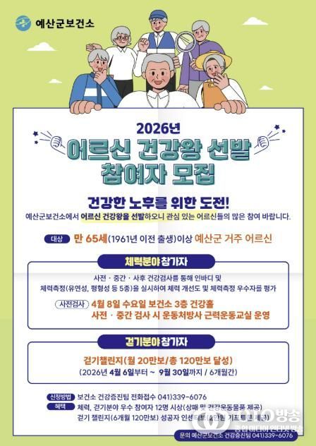 oto방송 김민석 기자 | 예산군보건소는 어르신의 자발적인 신체활동 참여를 유도하고 건강한 노후생활을 지원하기 위해 ‘2026년 어르신 건강왕 선발’ 참가자를 모집한다고 밝혔다.